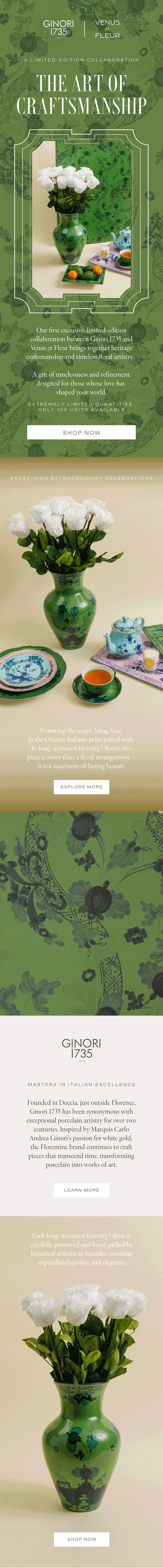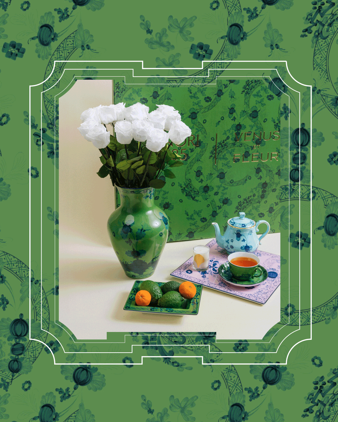 An elegant Spring table for a gathering of family and friends celebrates the many splendors of the Venus et Fleur x Ginori offering. The vase rests at the center of the table, with bright fruits and fragrant delights piled high on tableware from Ginori, while elegant flatware and linens bring life to the setting.